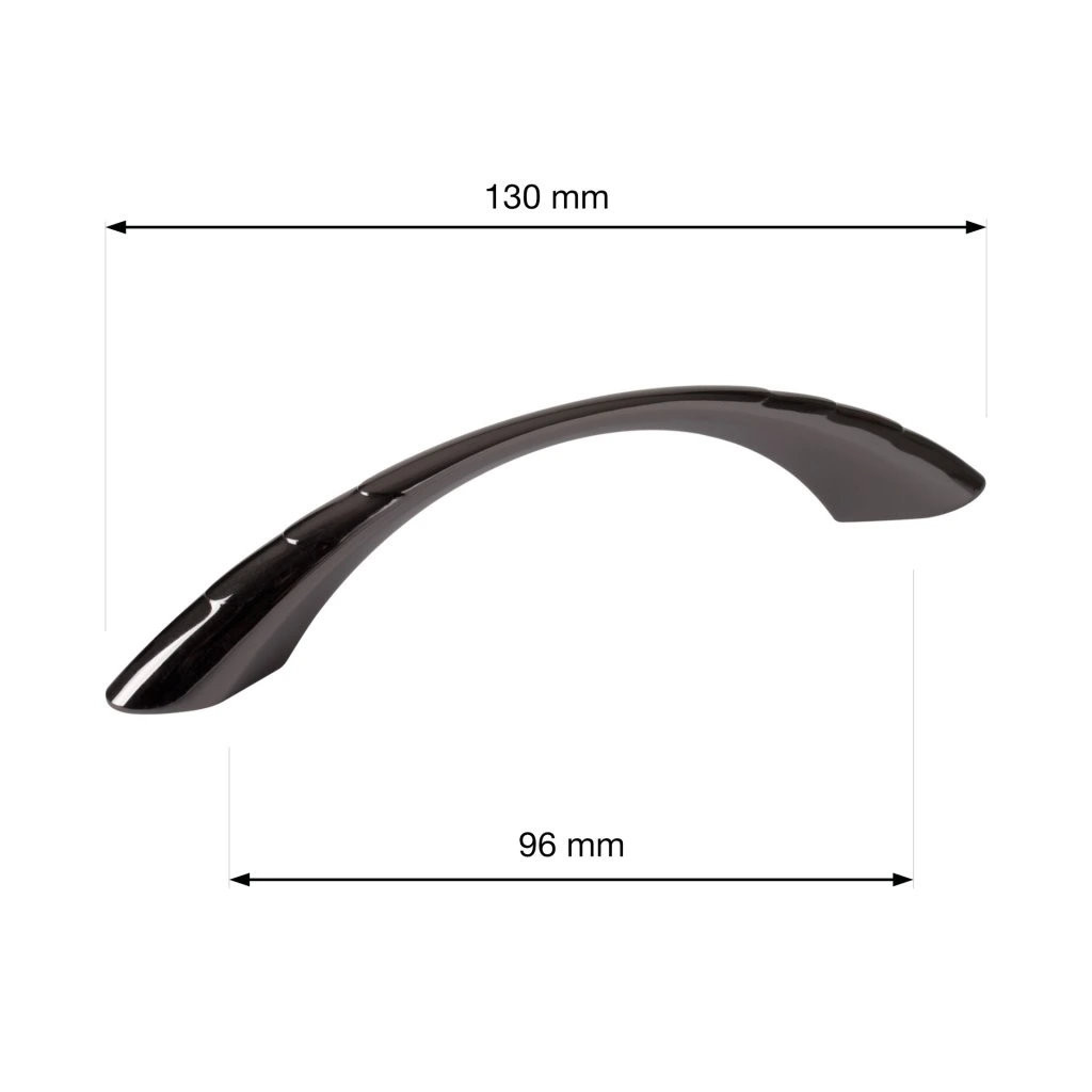 Linda bútorfogantyú klasszikus dizájnnal, 96 mm-es rasztermérettel és fekete nikkel bevonattal. A fogantyú hossza 130 mm, szélessége 12 mm és magassága 27 mm. Rögzítőcsavarokkal együtt.