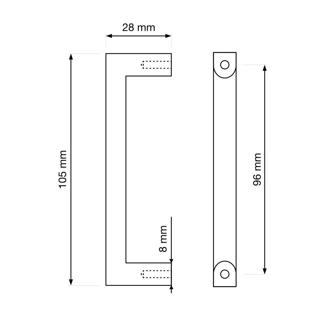 Modern Prisma bútorfogantyú 96 mm-es tengelytávolsággal és szálcsiszolt szatén nikkel felülettel. Fogantyúhossz 105 mm, szélesség 8 mm és magasság 28 mm. Rögzítőcsavarokkal együtt.