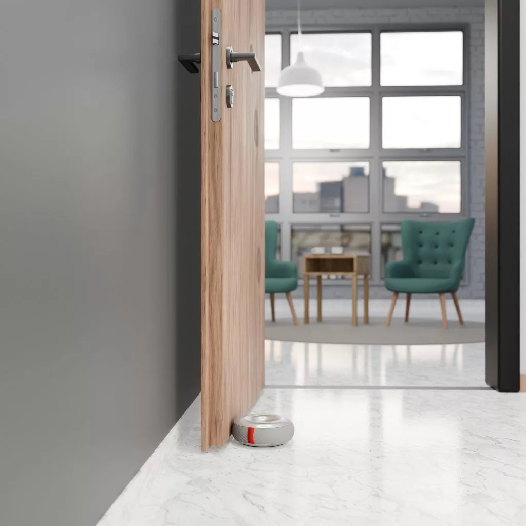 Masszív, szabadon álló DOORNUT formatervezett ajtóütköző matt króm felülettel, 106 mm átmérővel, 42 mm magassággal és 0,83 kg súllyal. Védi a falakat és a bútorokat az ajtó ütődéseitől.