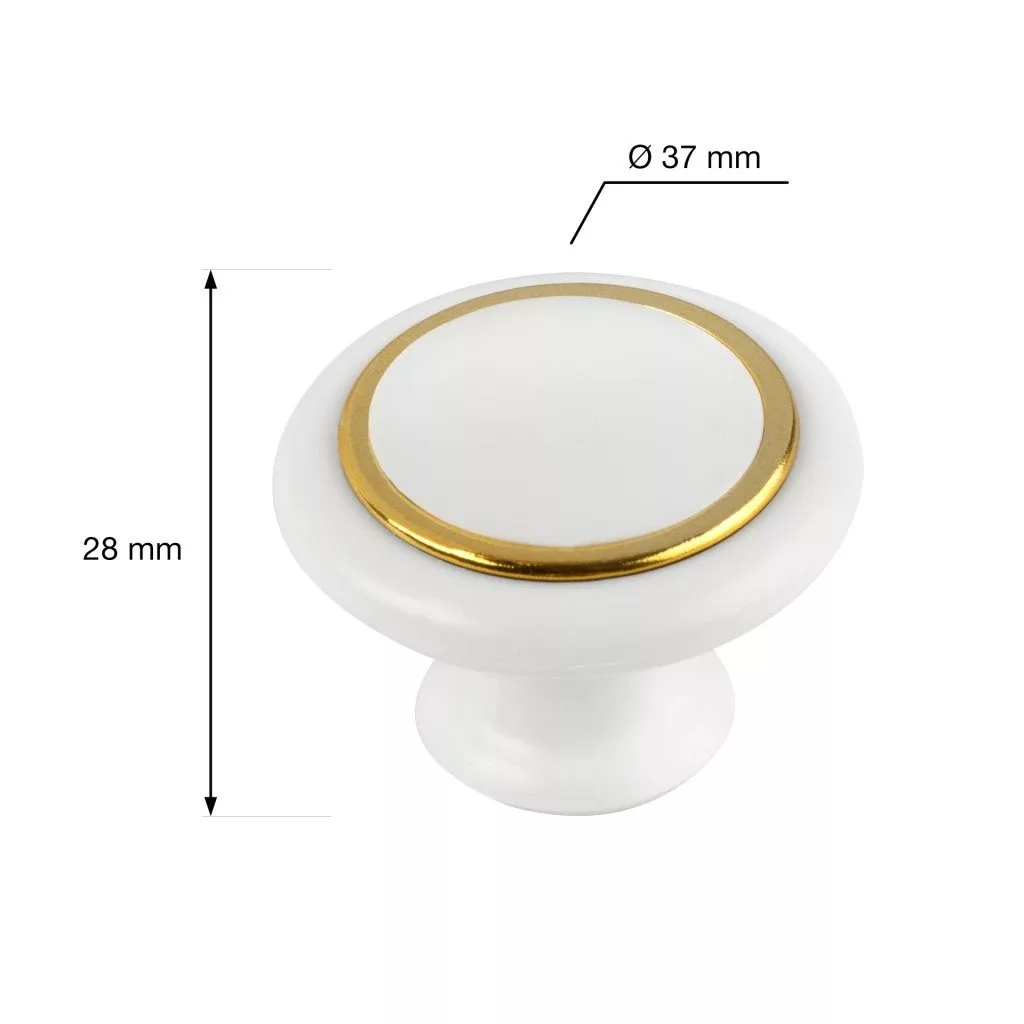 Műanyag Aqua bútorgomb modern dizájnban, fehér és arany színek kombinációjában, 37 mm átmérővel és 28 mm magassággal. A csomag tartalmaz egy rögzítőcsavart.